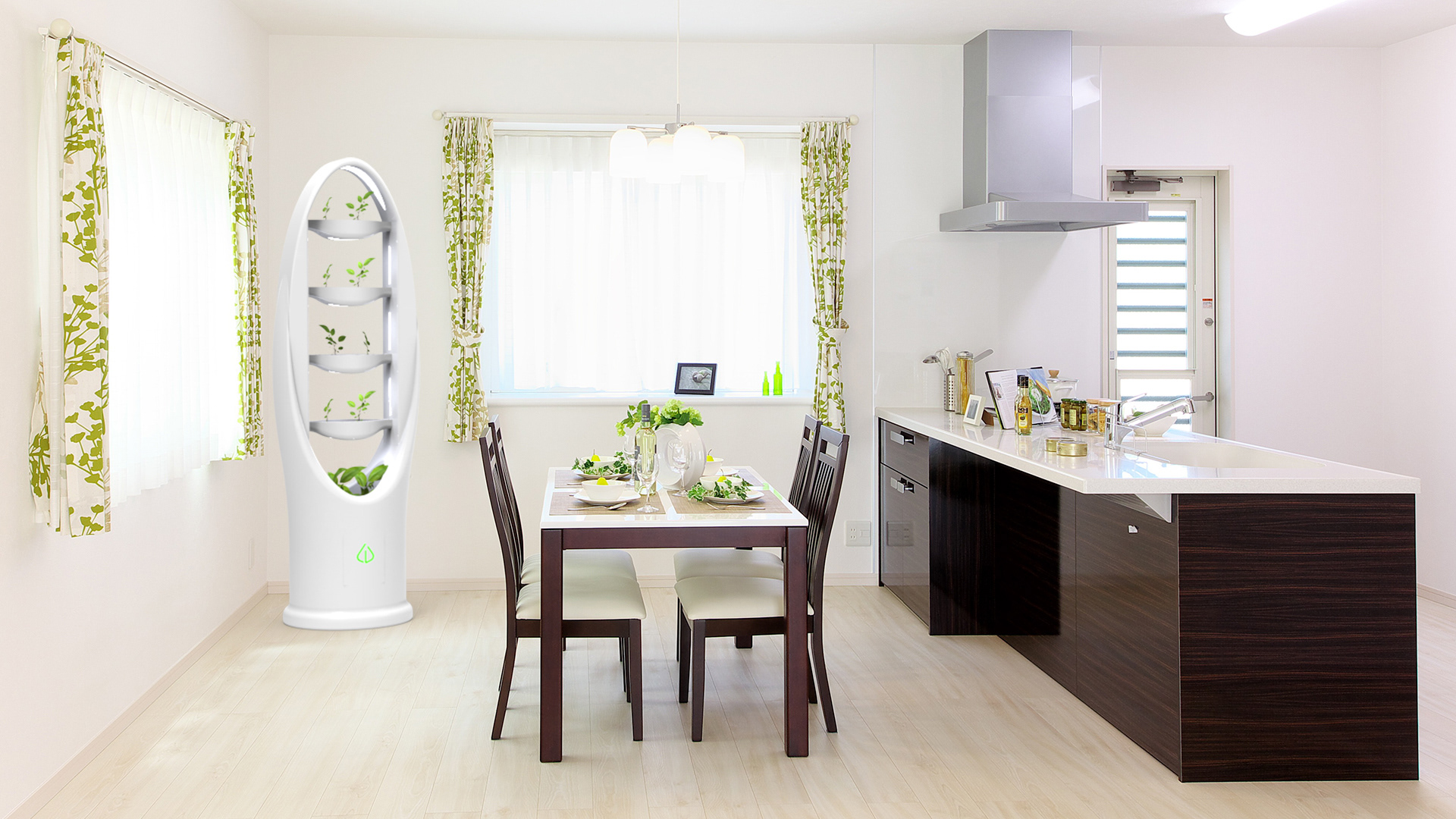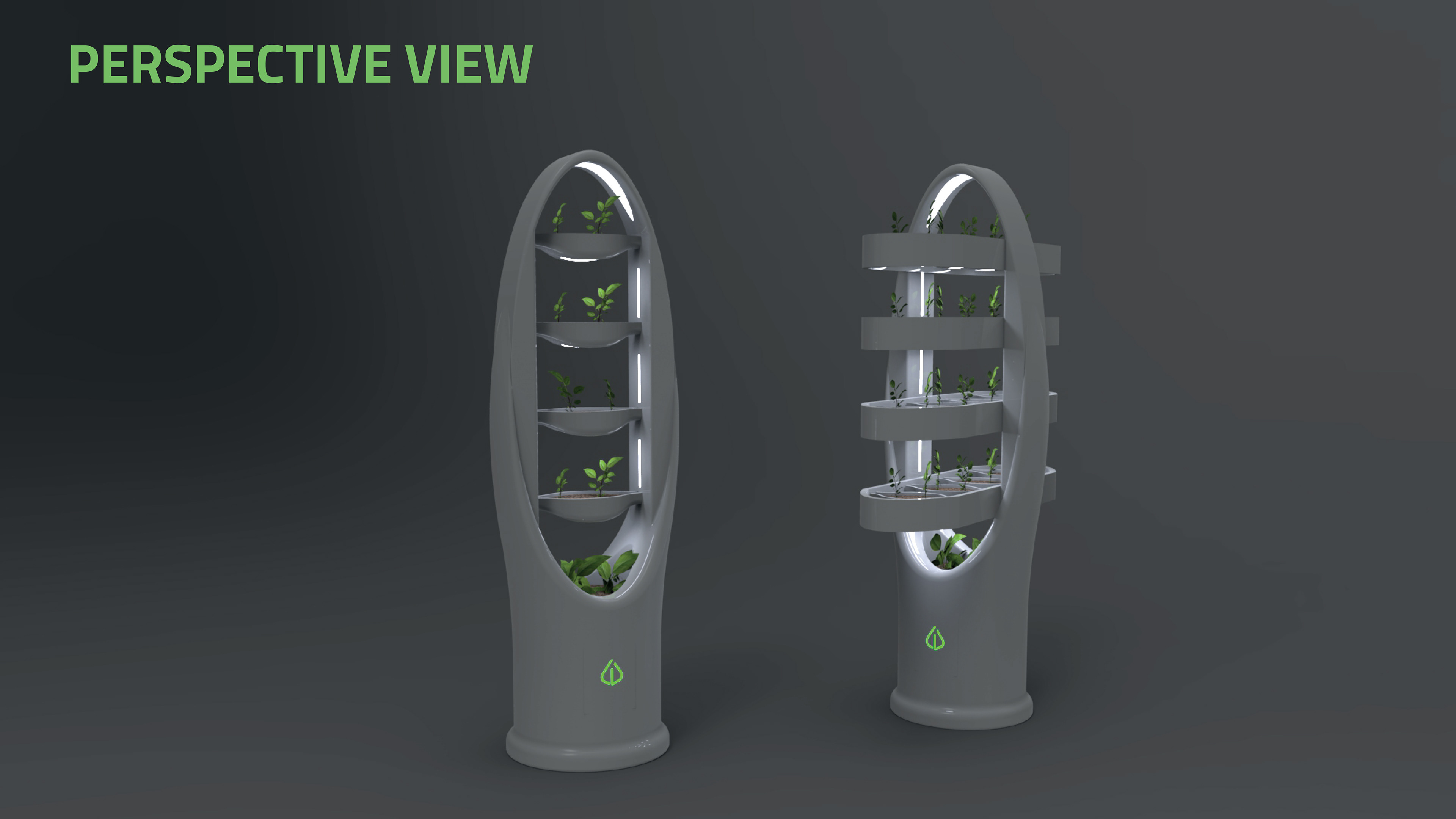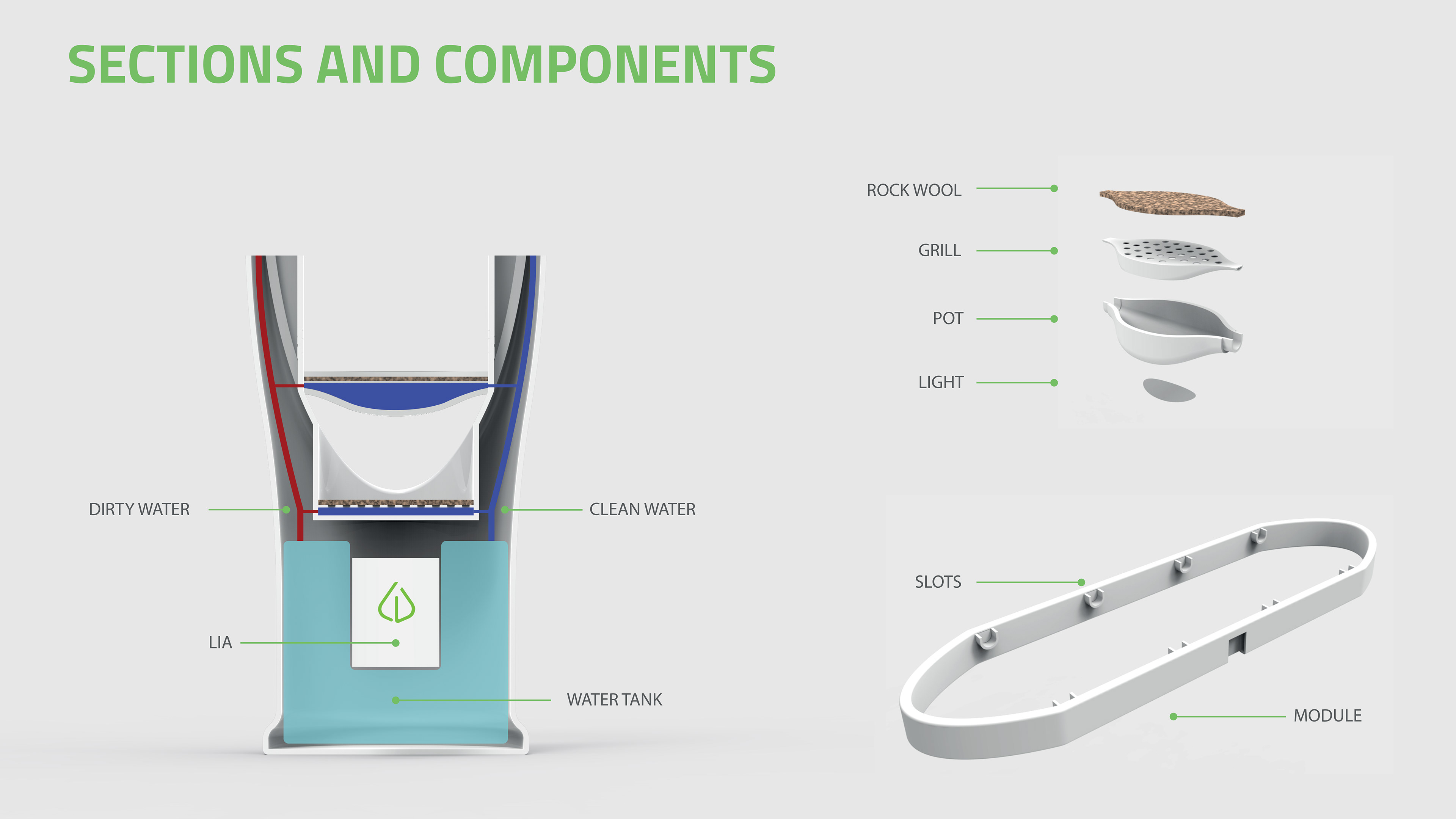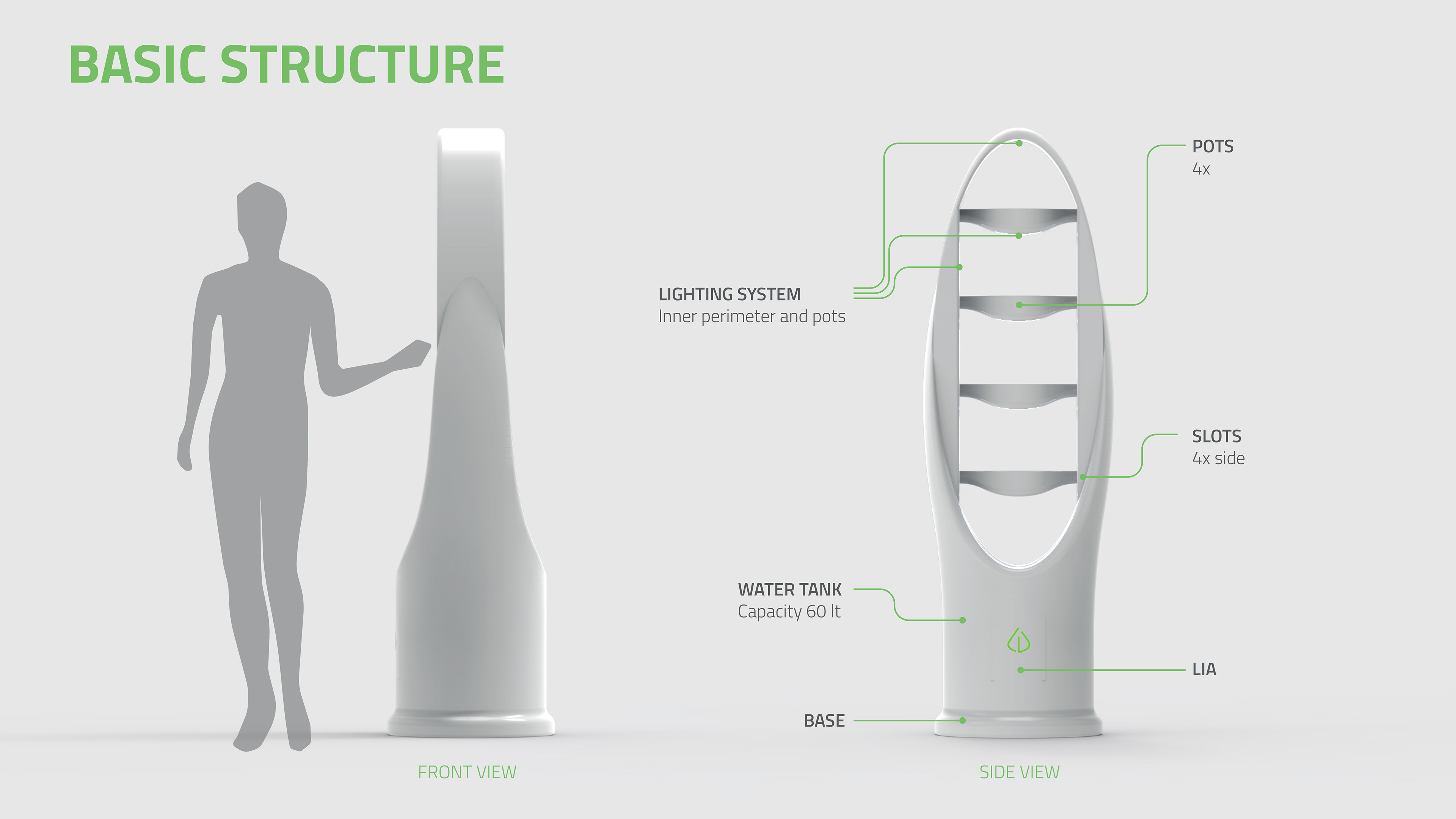Inside the base there is a water tank and a LIA (automatic hydroponic system).